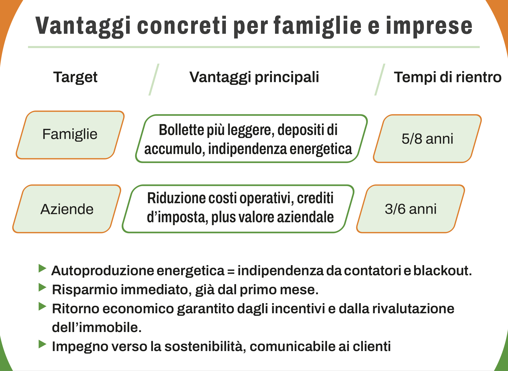 - Consulenza personalizzata: analisi energetica gratuita, calcolo preventivo e tempi di rientro.